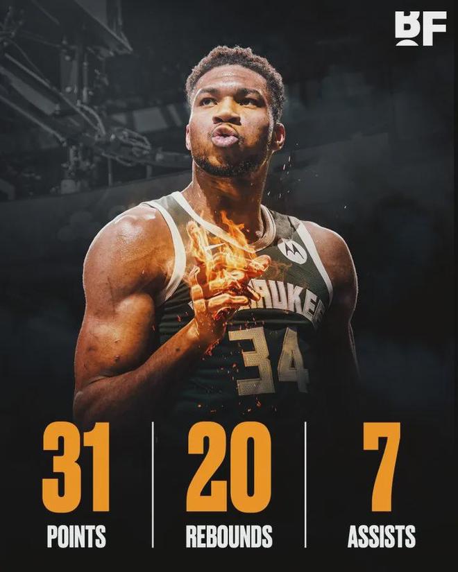 在38分钟的出场时间内,字母哥运动战14投11中,三分球也有2投全中,在罚球线上更是12罚7中,独得31分20篮板7助攻1封盖,其中有7个前场篮板。
