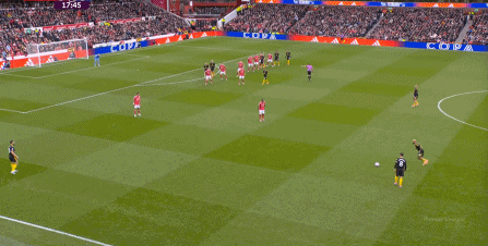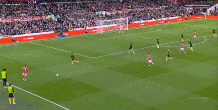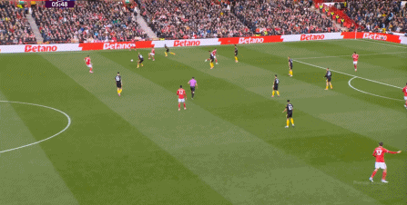 于是,最近这段时间看起来很好用的体系,在运转上出现了明显的问题,球队的进攻需要另辟蹊径,所以在30分钟前后,是布鲁诺和库尼亚这一侧,通过转移到右侧,让曼联形成了进攻: